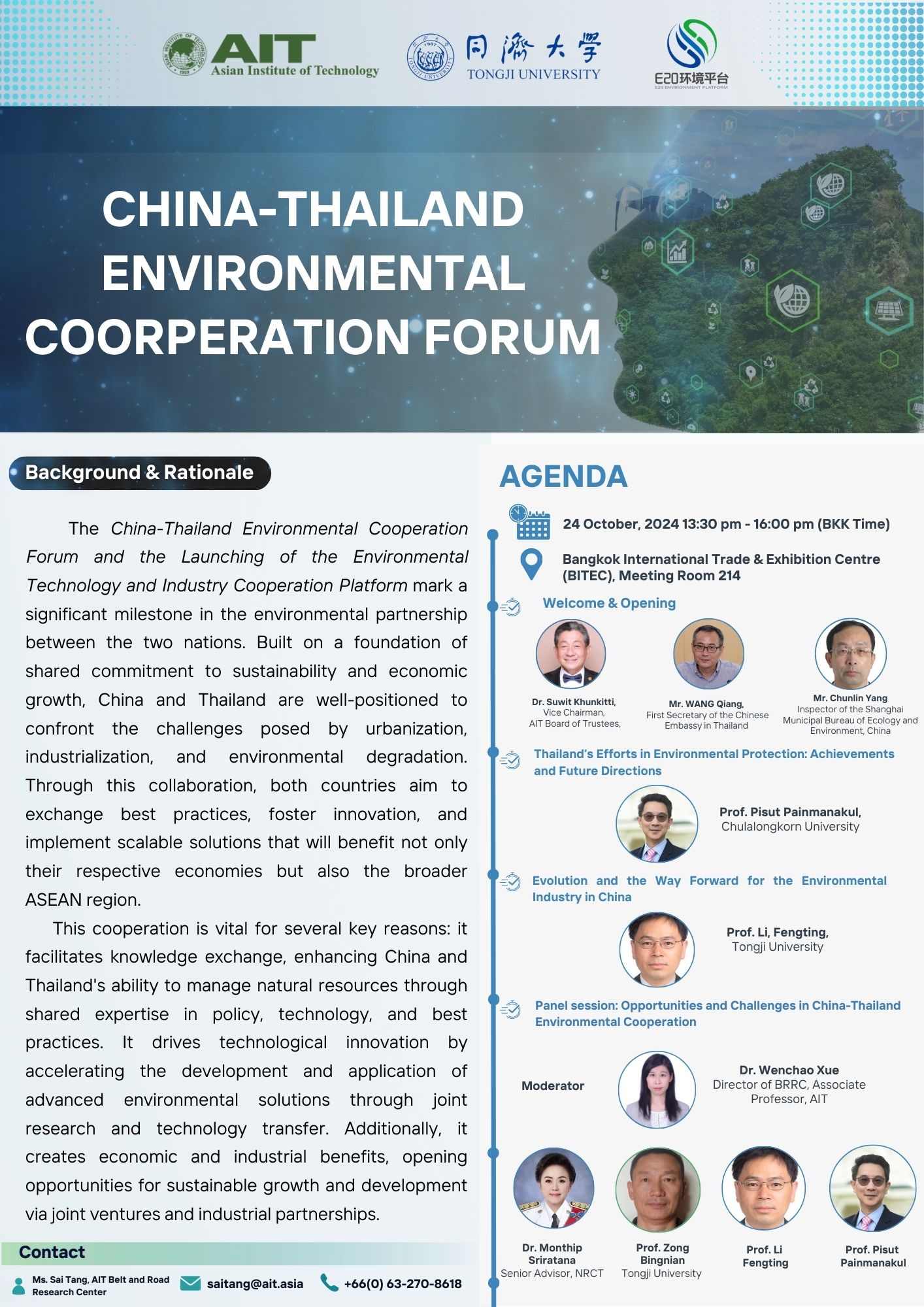 On 24th, October 2024 – AIT BRRC is organizing “The China-Thailand Environmental Cooperation Forum and The Launching Ceremony of the China-Thailand Environmental Technology and Industry Cooperation Platform” in BITEC, Bangna, Bangkok, Thailand. Other co-organizers include Tongji University from China, and E20 Environmental Platform. This China-Thailand Environmental Cooperation Forum is one important session of The Green Tech Expo 2024 (www.greentechnologyexpo.co ) , which is from 24th to 26th in EH102. AIT has been co-organizing the Green Tech Expo for two years. AIT Booth is TH54 this year.